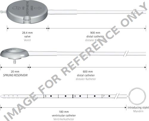 DUALSWITCH Shunt System, DP unit not adjustable, press. horiz. 5 cmH2O, grav. unit not adjustable, 40 cmH2O, press. vert. 40 cmH2O, for burrhole Ø 9.5 mm, sterile