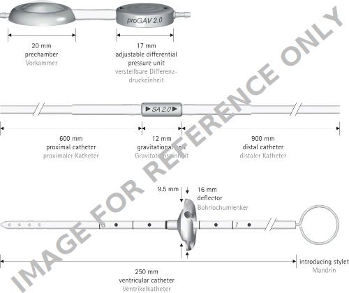 proGAV® 2.0 Shunt System, DP unit adjustable, press. horiz. 0 - 20 cmH2O, grav. unit not adjustable, 30 cmH2O, press. vert. 30 - 50 cmH2O, sterile