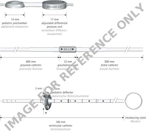 proGAV® 2.0 Shunt System, DP unit adjustable, press. horiz. 0 - 20 cmH2O, grav. unit not adjustable, 35 cmH2O, press. vert. 35 - 55 cmH2O, sterile