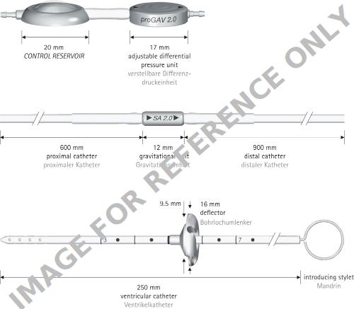 proGAV® 2.0 Shunt System, DP unit adjustable, press. horiz. 0 - 20 cmH2O, grav. unit not adjustable, 30 cmH2O, press. vert. 30 - 50 cmH2O, sterile