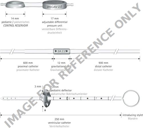 proGAV® 2.0 Shunt System, DP unit adjustable, press. horiz. 0 - 20 cmH2O, grav. unit not adjustable, 35 cmH2O, press. vert. 35 - 55 cmH2O, sterile