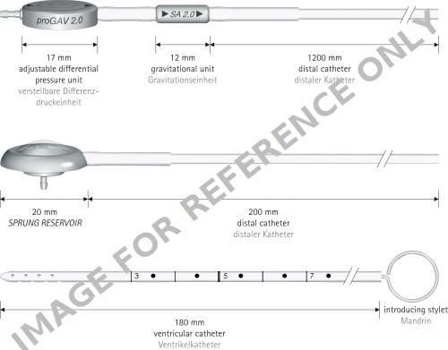 proGAV® 2.0 Shunt System, DP unit adjustable, press. horiz. 0 - 20 cmH2O, grav. unit not adjustable, 15 cmH2O, press. vert. 15 - 35 cmH2O, sterile