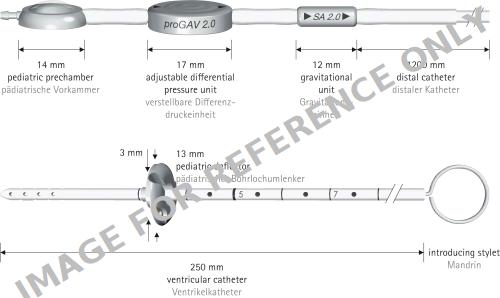 proGAV® 2.0 Shunt System, DP unit adjustable, press. horiz. 0 - 20 cmH2O, grav. unit not adjustable, 15 cmH2O, press. vert. 15 - 35 cmH2O, sterile