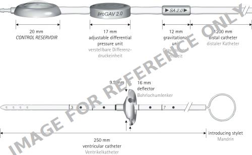 proGAV® 2.0 Shunt System, DP unit adjustable, press. horiz. 0 - 20 cmH2O, grav. unit not adjustable, 25 cmH2O, press. vert. 25 - 45 cmH2O, sterile