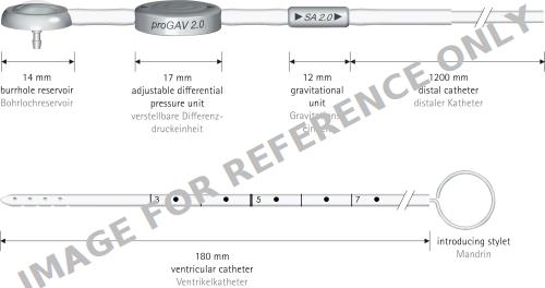 proGAV® 2.0 Shunt System, DP unit adjustable, press. horiz. 0 - 20 cmH2O, grav. unit not adjustable, 35 cmH2O, press. vert. 35 - 55 cmH2O, sterile